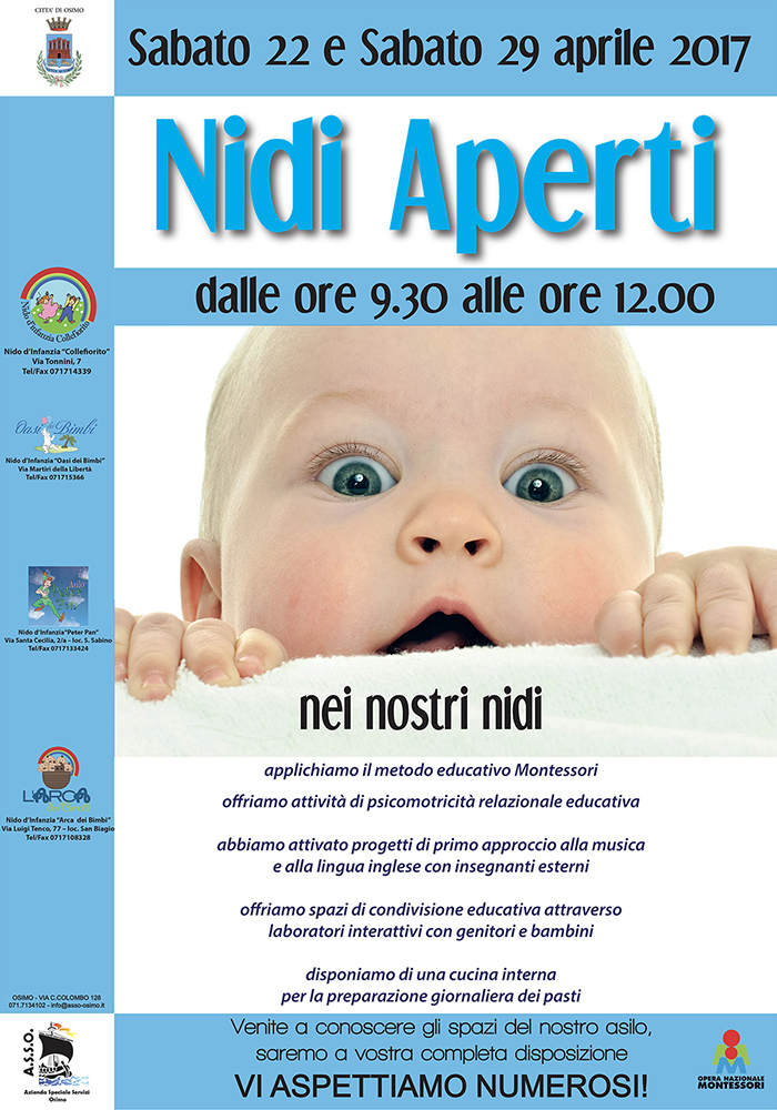 Promossa dall’A.S.S.O. (Azienda servizi speciali Osimo), torna anche quest’anno l’iniziativa ‘Nidi Aperti’. Nell’occasione, le famiglie potranno visitare, sabato 22 e 29 aprile prossimi, dalle ore 9.30 alle ore 12, i nidi d’infanzia gestiti dal Comune di Osimo, e dall’A.S.S.O. in particolare. Tutti i genitori interessati potranno visitare l’‘Arca dei Bimbi’ (via L. Tenco 77 a San Biagio), ‘Collefiorito’ (via Tonnini 7 a Osimo), l’‘Oasi dei bimbi’ (via Martiri della Libertà ad Osimo, zona Sacra Famiglia) e il ‘Peter Pan’ (via Santa Cecilia 2 a San Sabino).