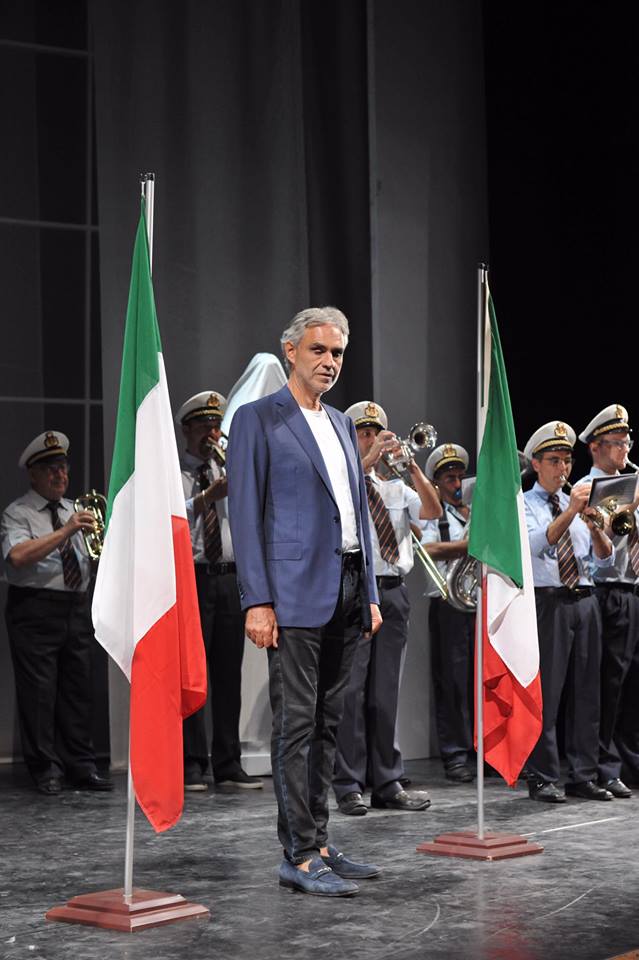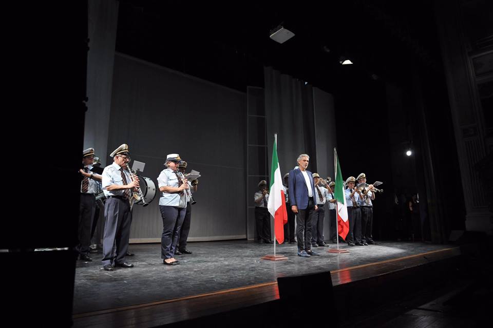 Prima dell'inizio della Tosca al Teatro La Nuova Fenice, Bocelli esegue l'Inno di Mameli accompagnato dalle note della