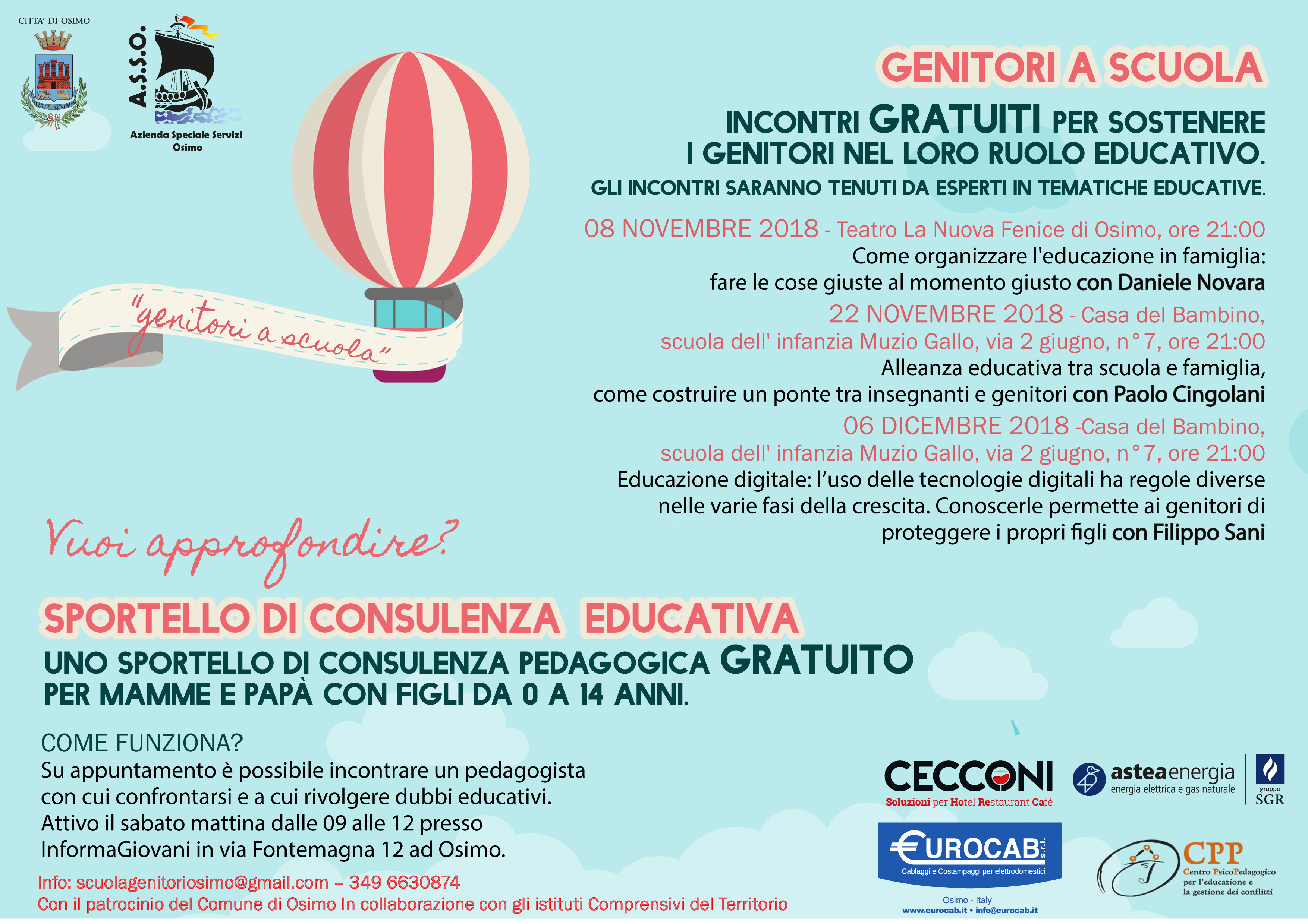 Un ciclo di incontri gratuiti per sostenere i genitori nel loro delicato ruolo educativo. Un progetto che nasce dalla volontà e dall’esperienza dell’Azienda Speciale Servizi Osimo (A.S.S.O.) con il patrocinio del Comune di Osimo. L’obiettivo è fornire un supporto educativo professionale ai genitori e a tutti coloro che si occupano quotidianamente dell’educazione di bambini e adolescenti fino ai 14 anni. Coinvolti nel progetto tutti gli istituti comprensivi scolastici del territorio, con l’intento di condividere informazioni qualificate e professionali con genitori ed educatori, per far crescere una vera e propria comunità educante. L’emergenza educativa nel nostro paese risulta essere un dato che aumenta in maniera esponenziale e mantenere un ruolo educativo risulta essere sempre più complicato, spesso il genitore diventa solo un amico servizievole nei confronti del proprio figlio, aumentando in lui la confusione. Questi alcuni dei temi che saranno trattati dagli esperti chiamati a relazionare nell’arco del progetto “Genitori a scuola”, che mira a recuperare la giusta distanza educativa, uno spazio dove i ruoli sono chiari, dove l’organizzazione non si basa solo sui discorsi ma che va dritta al sodo, garantendo che i figli vivano bene le fasi della loro vita.