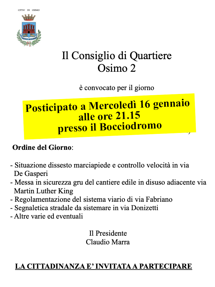 CONVOCAZIONE CdQ OSIMO 2 - 15 gennaio RINVIATO AL 16