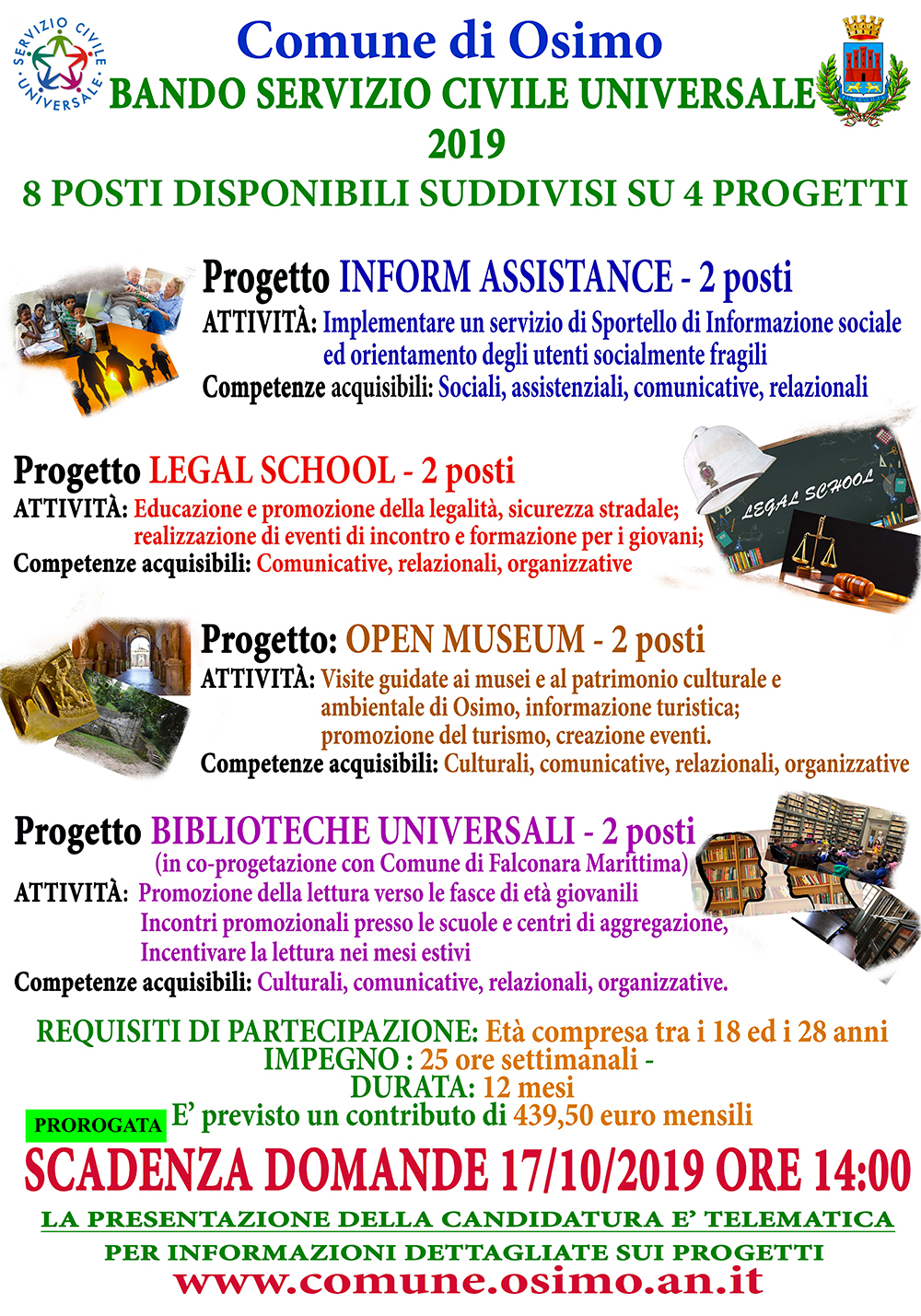 È prorogata di una settimana la scadenza del bando per la selezione di 39.646 volontari, inizialmente fissata alle ore 14.00 del 10 ottobre 2019.